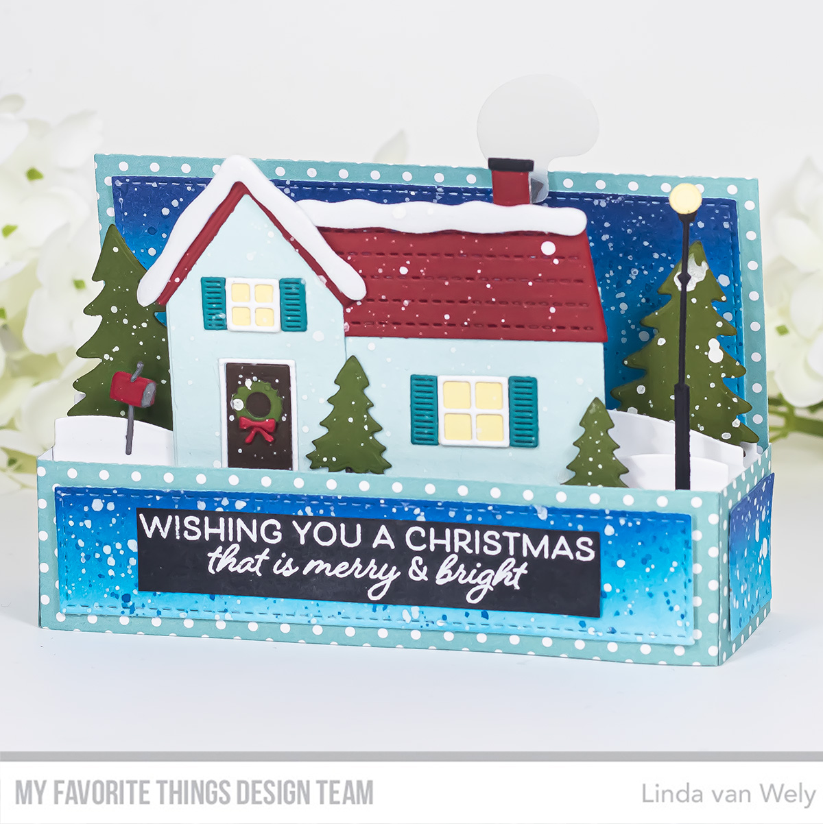 I then diecutted all my needed pieces for the house, trees, mailbox and lantern from different colours of MFT Cardstock and put all the pieces together. Wouldn't you just want to live here? I added three pieces of snowy underground to my frame, diecutted with the slimline Snow Drifts Outside the Box die-namics and added the sentiment from the set to finish this box card with!